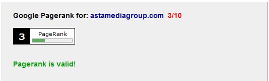 Hasil pengecekan menunjukkan bahwa situs astamediagroup.com mempunyai nilai pagerank 3 dan valid seperti yang dijelaskan pada tulisan berwarna hijau di gambar. Jika pagerank tidak valid maka akan tertera kata fake (palsu).