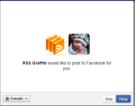 - Pada saat Anda mengakses RSS Grafitti akan ada pop up pesan berisi permintaan untuk memberikan akses. Silahkan Anda klik go to permission dialog. Setelah itu akan ada permintaan persetujuan Anda agar RSS Grafitti dapat mengakses profil umum, daftar teman dan group group yang Anda tergabung di dalamnya.